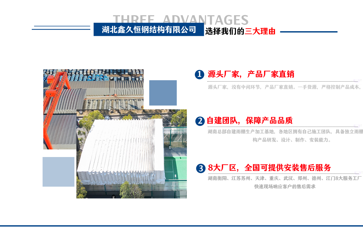 湖北鑫久恒鋼結構有限公司是一家電動雨棚、膜結構車棚研發,生產銷售,施工安裝于一體的專業鋼結構科技公司,主要產品有伸縮雨棚,電動雨棚,膜結構車棚等?! 『系貐^職員目前有80多人,占地面積20000平方米,廠房面積15600平方米,配備先進的生產流水線,使每件品質產品的堅實基礎?! 」驹谔K州、天津、重慶、武漢、德州、烏魯木齊、江門均設有服務工廠,總人員共300多人,擁有專業的技術團隊,配備先進的設備和流水線生產,產能高,貨源充足,發貨速度快,服務區域廣。  移動伸縮棚適用于通道臨時倉儲、戶外運動遮陽、污水池遮蓋、能源交通、熱力化工、礦山、船舶制造及市政建設、物流、碼頭等領域的構件制作加工,成品半成品存放、倉庫、野外儀器設備操作用房等。尤其是對工廠發貨、倉儲臨時遮雨防嗮,梅雨期較長、建設周期較短的工程施工等特別適用。還可根據用戶需求量身定制、適合企業所需不同款式的產品。  我公司堅持“誠信社會為本,客戶滿意為榮”的經營理念,做到質量把控,嚴格管理,精益求精,恪守承諾。使鑫久恒逐步走向成熟,其系統化、專業化日趨完善。以專業的技術、科學的管理,更高的產品質量,優良的企業信譽,真誠的客戶服務,靈活多樣的經營方式和務實創新的企業精神愿與社會各界攜手合作,為推動智能鋼結構建筑事業的發展而不斷努力。...